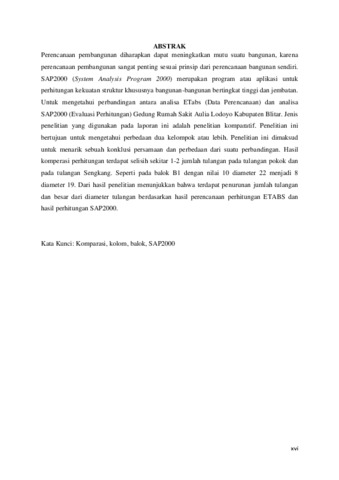 Perencanaan pembangunan diharapkan dapat meningkatkan mutu suatu bangunan, karena perencanaan pembangunan sangat penting sesuai prinsip dari perencanaan bangunan sendiri. SAP2000 (System Analysis Program 2000) merupakan program atau aplikasi untuk perhitungan kekuatan struktur khususnya bangunan-bangunan bertingkat tinggi dan jembatan. Untuk mengetahui perbandingan antara analisa ETabs (Data Perencanaan) dan analisa SAP2000 (Evaluasi Perhitungan) Gedung Rumah Sakit Aulia Lodoyo Kabupaten Blitar. Jenis penelitian yang digunakan pada laporan ini adalah penelitian komparatif. Penelitian ini bertujuan untuk mengetahui perbedaan dua kelompok atau lebih. Penelitian ini dimaksud untuk menarik sebuah konklusi persamaan dan perbedaan dari suatu perbandingan. Hasil komperasi perhitungan terdapat selisih sekitar 1-2 jumlah tulangan pada tulangan pokok dan pada tulangan Sengkang. Seperti pada balok B1 dengan nilai 10 diameter 22 menjadi 8 diameter 19. Dari hasil penelitian menunjukkan bahwa terdapat penurunan jumlah tulangan dan besar dari diameter tulangan berdasarkan hasil perencanaan perhitungan ETABS dan hasil perhitungan SAP2000.