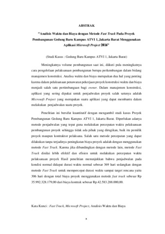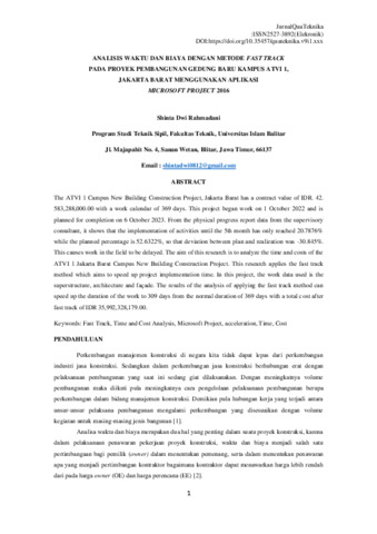 Rahmadani, Shinta Dwi (2024) Analisis waktu dan biaya dengan metode fast track pada pembangunan gedung baru kampus ATVI 1 Jakarta Barat menggunakan aplikasi microsoft project 2016. Other thesis, Universitas islam balitar blitar.