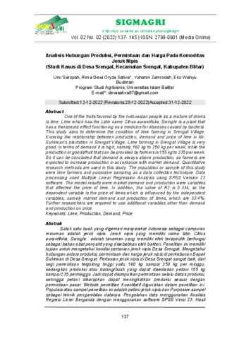 Umi, Saropah and Rima Dewi, Oryza Sativa and Yuhanin, Zamrodah and Eko Wahyu, Budiman (2022) Analisis Hubungan Produksi, Permintaan dan Harga Pada Komoditas Jeruk Nipis (Studi Kasus di Desa Srengat, Kecamatan Srengat, Kabupaten Blitar). sigmagri, 02 (2): 8. pp. 137-145. ISSN 2798-0901