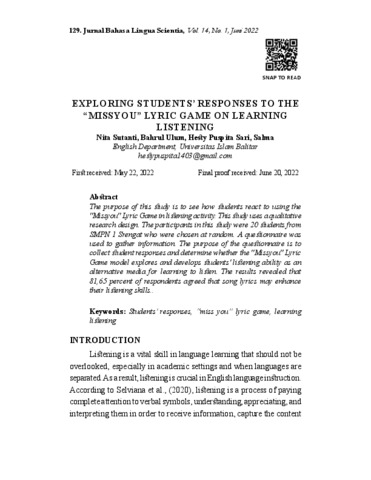 Sutanti, Nita and Puspita sari, Hesty and Ulum, Bahrul and Salma, Salma (2022) EXPLORING STUDENTS’ RESPONSES TO THE “MISSYOU” LYRIC GAME ON LEARNING LISTENING. Jurnal Bahasa Lingua Scientia, 14 (1). pp. 129-142.